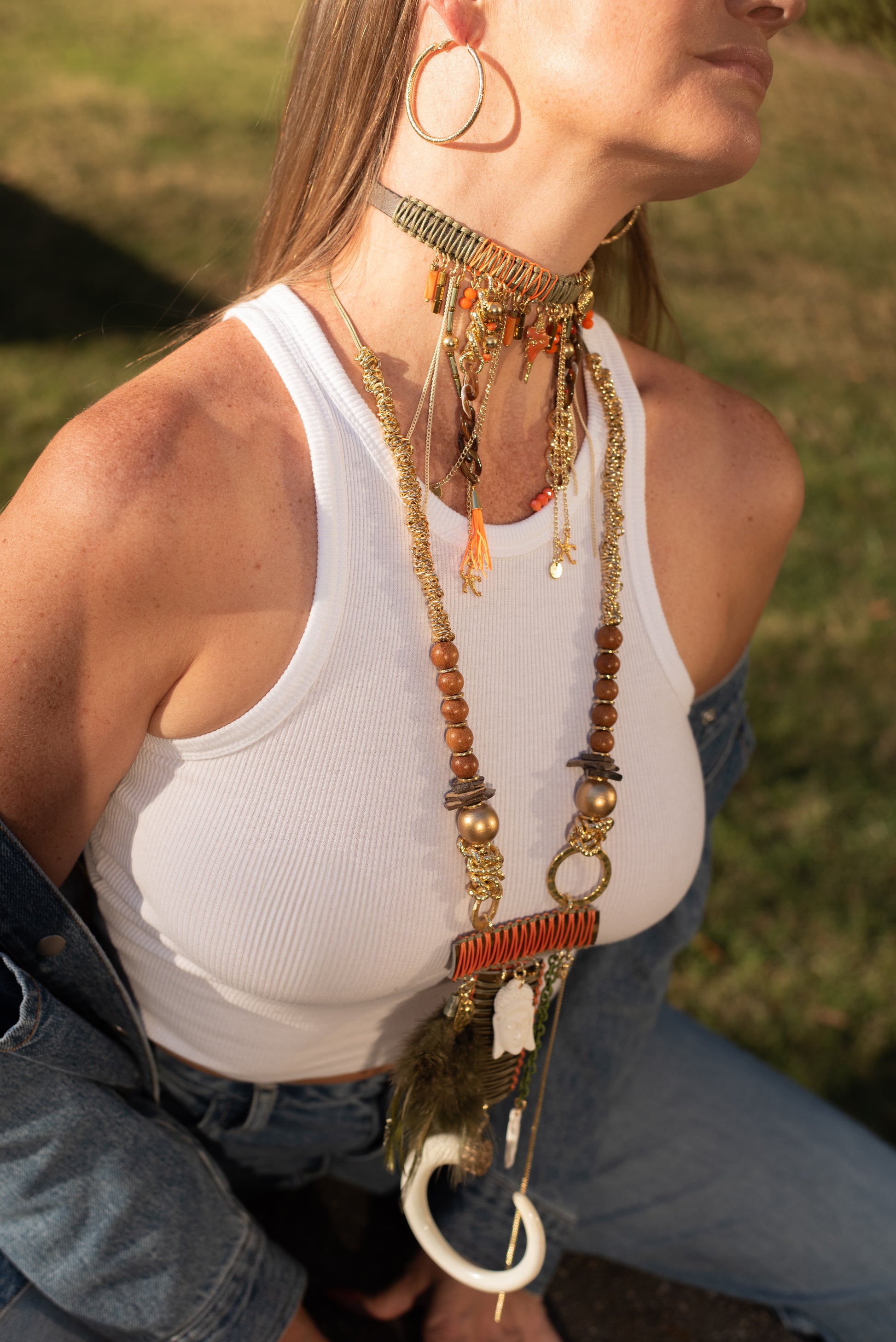 Hand-strung wooden beads create a natural rhythm along the neckline, flowing into intricate gold details, wrapped cordwork, and layered chains that add dimension and movement. Feathers soften the composition with their airy texture, symbolizing freedom, intuition, and the lightness that balances the boldness of the central horn.